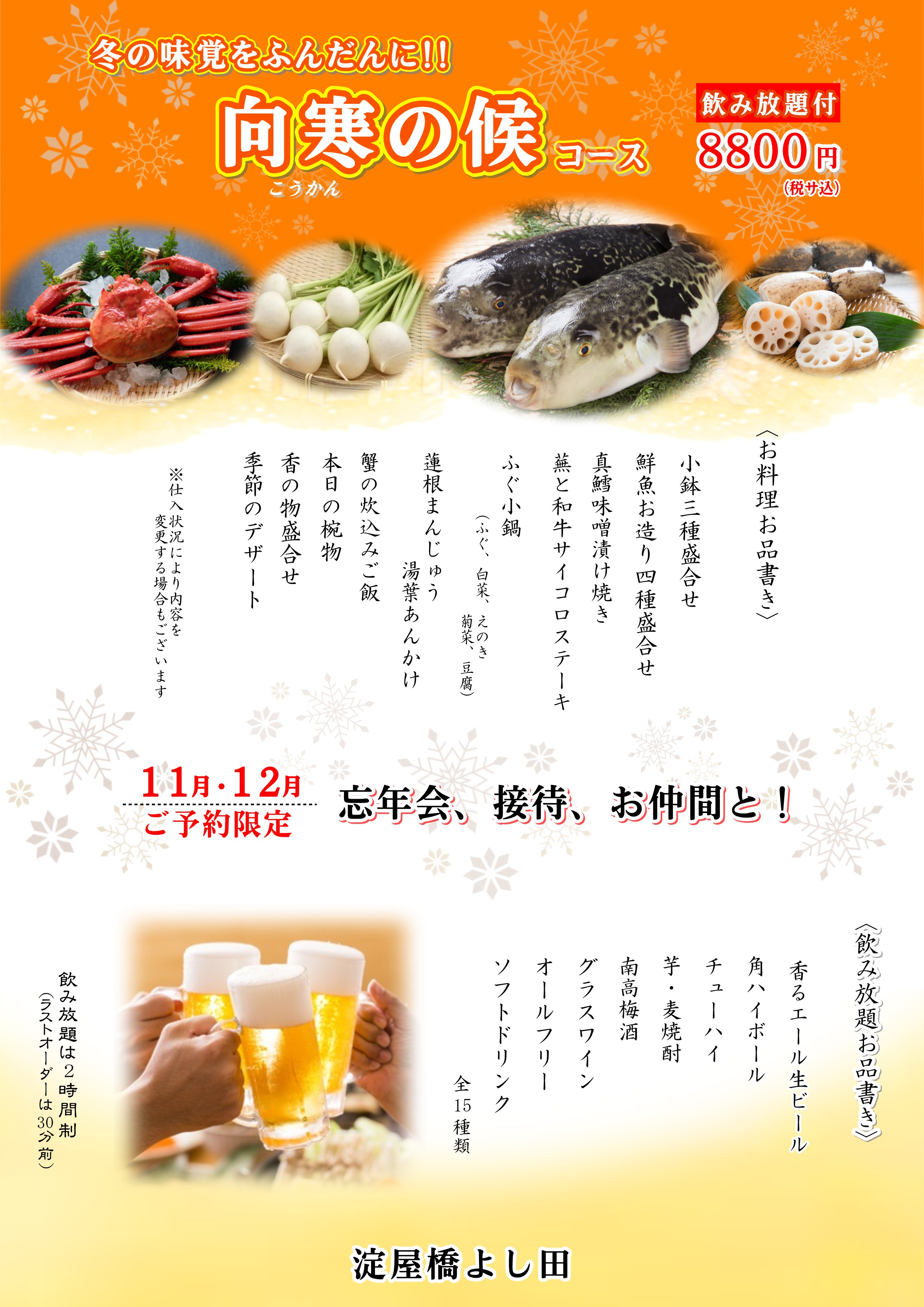 いつもよし田をご利用いただき誠にありがとうございます。 淀屋橋店にて11月12月限定 向寒の候コースを開始いたします。 冬の訪れを感じるこの季節、あたたかな味わいと旬の食材を揃え、よし田で心まで温まるひとときをお過ごしください。 詳しくは上記画像をご覧ください。 《ご予約はこちらから》 ●淀屋橋店:06-6208-1780 ぜひ、ご予約お待ちしております!