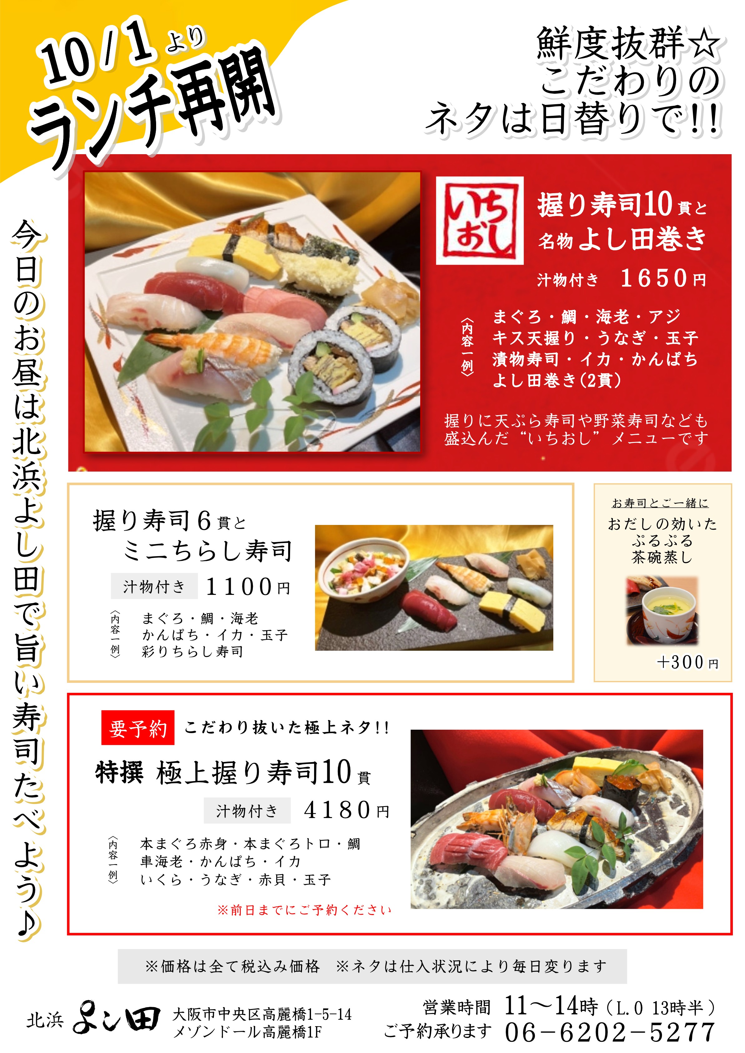 いつもよし田をご利用いただき誠にありがとうございます。 北浜店にて10/1より、ランチ営業を再開いたします。 旨い寿司をご用意してお待ちしております。 詳しくは上記画像をご覧ください。 《ご予約はこちらから》 ●北浜店:06-6202-5277 是非、ご予約お待ちしております!