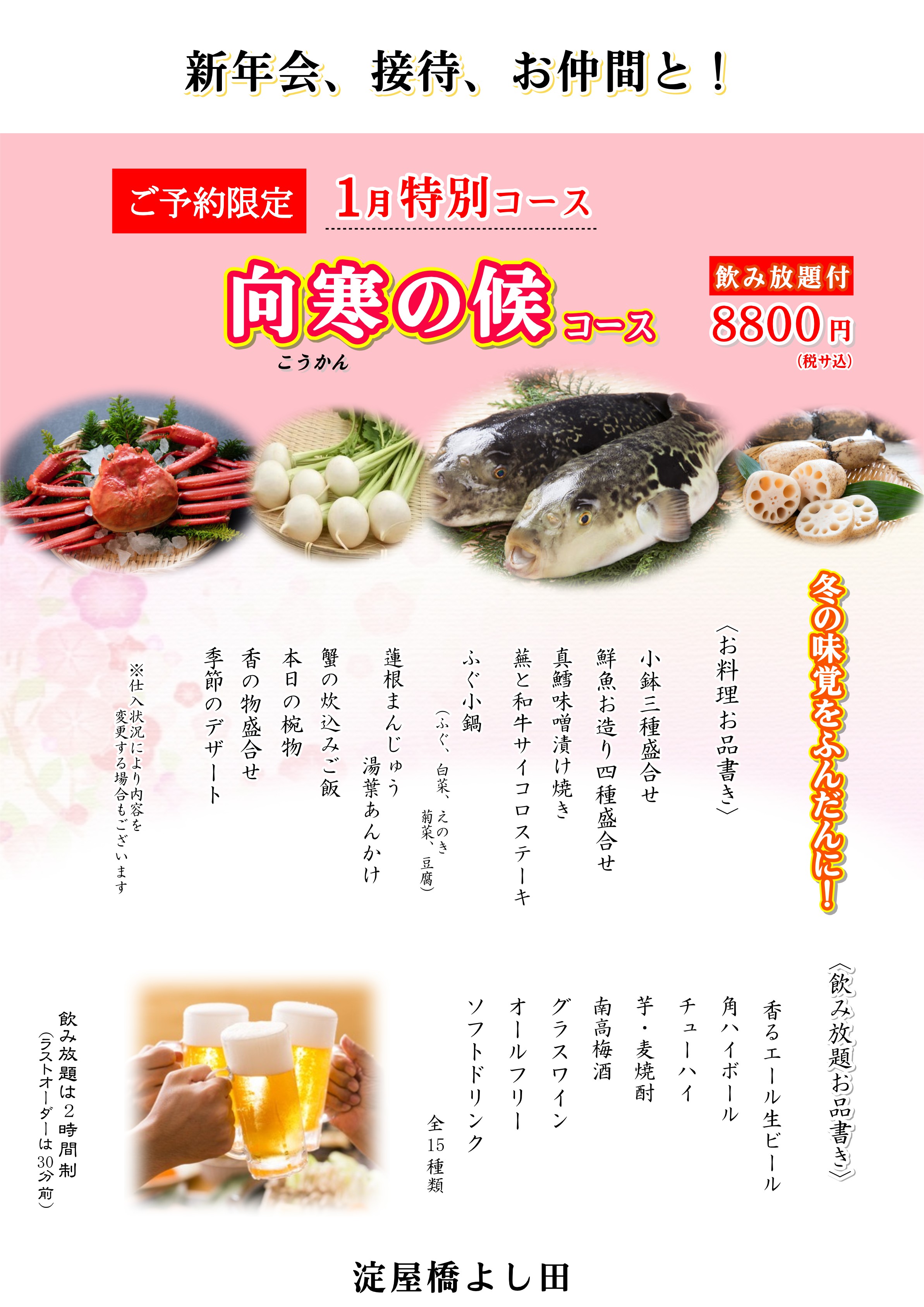 いつもよし田をご利用いただき誠にありがとうございます。 淀屋橋店にて1月限定 向寒の候コースを開始いたします。 冬の訪れを感じるこの季節、あたたかな味わいと旬の食材を揃え、よし田で心まで温まるひとときをお過ごしください。 詳しくは上記画像をご覧ください。 《ご予約はこちらから》 ●淀屋橋店:06-6208-1780 ぜひ、ご予約お待ちしております!