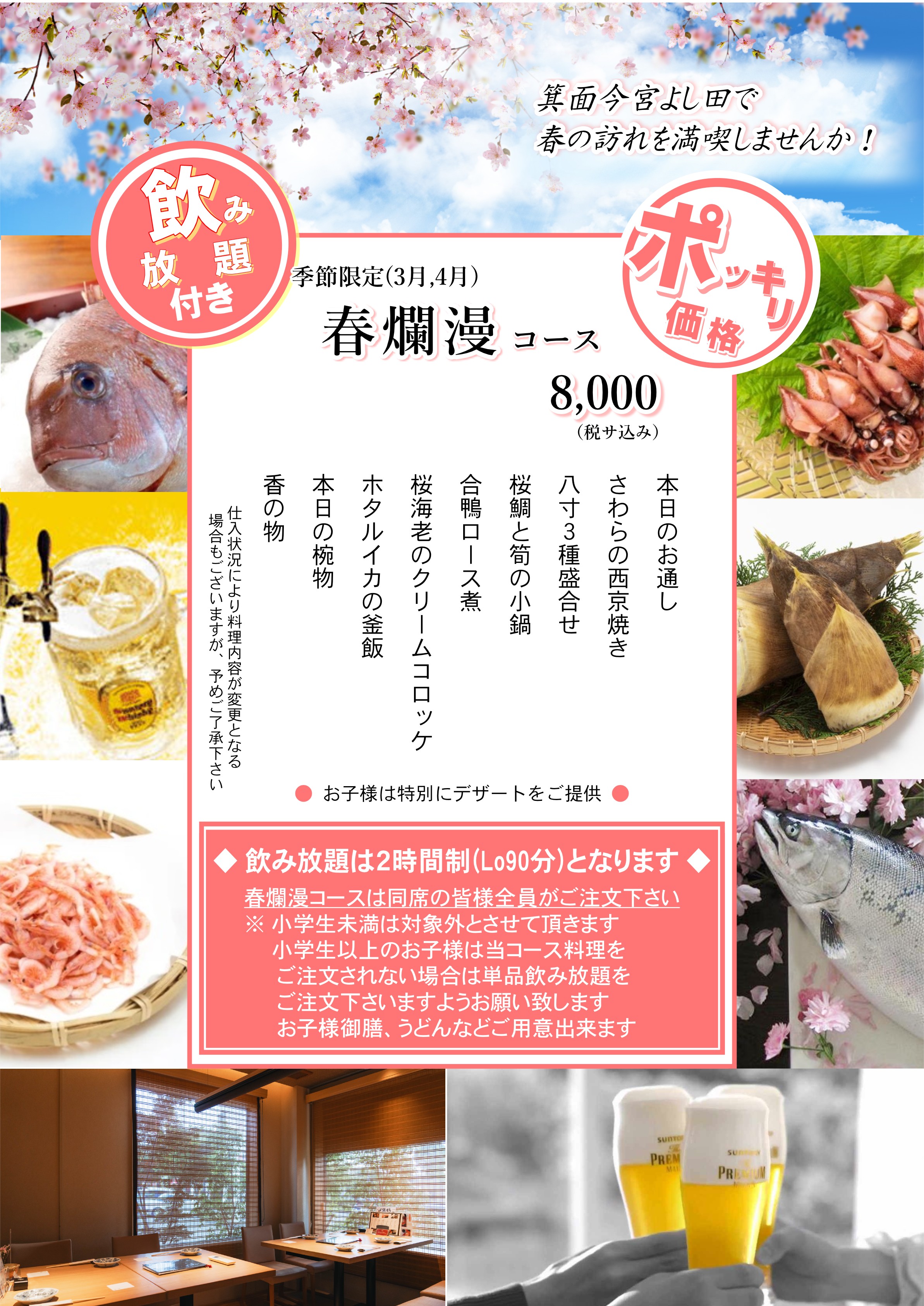いつもよし田をご利用いただき誠にありがとうございます。 やわらかな陽ざしとともに、旬の味覚がいっそう引き立つこの季節。 彩り豊かな春の恵みを取り入れた特別コースをご用意しました。 ご家族やお仲間とのお集まりに、 よし田で、心華やぐ春のひとときを。 《ご予約はこちらから》 ▼箕面今宮よし田 〇お電話:072-737-5338 〇食べログ:こちら 是非、ご予約お待ちしております!